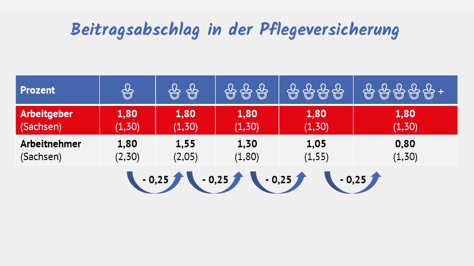 Für Arbeitnehmer mit Elterneigenschaft reduziert sich der Beitragssatz zur Pflegeversicherung für jedes berücksichtigungsfähige Kind ab dem zweiten Kind bis zum fünften Kind um jeweils einen Beitragsabschlag in Höhe von 0,25 Beitragssatzpunkten: