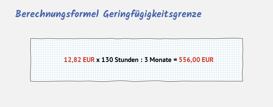 Die Geringfügigkeitsgrenze erhöht sich aufgrund der Anhebung des Mindestlohns zum 1. Januar 2025 auf 12,82 EUR brutto je Zeitstunde auf 556 EUR im Monat bzw. auf das Zwölffache (6.672 EUR) bei durchgehender mindestens zwölf Monate dauernder Beschäftigung gegen Arbeitsentgelt in jedem Monat. Hinsichtlich des gelegentlichen unvorhersehbaren Überschreitens gilt das Vierzehnfache (7.784 EUR).